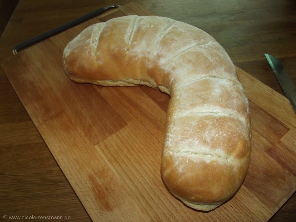 Dieses Baguette sieht diesmal eher wie ein übergroßes Hörnchen aus. Es enthält etwas mehr Olivenöl, wurde vor dem Backen eingeritzt und mit Mehl bestäubt.