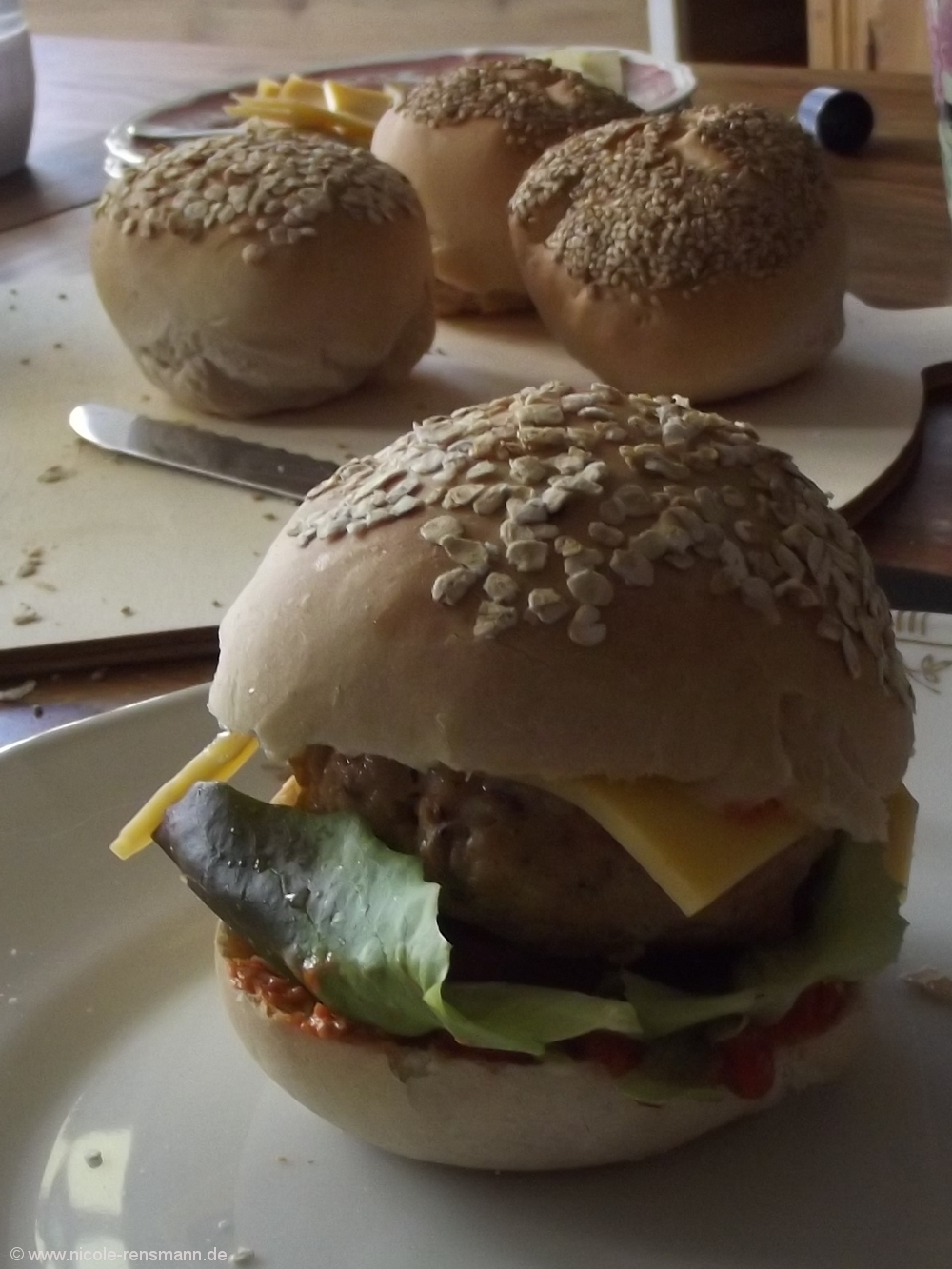 Fischburger mit Käse, Salat und Gurke